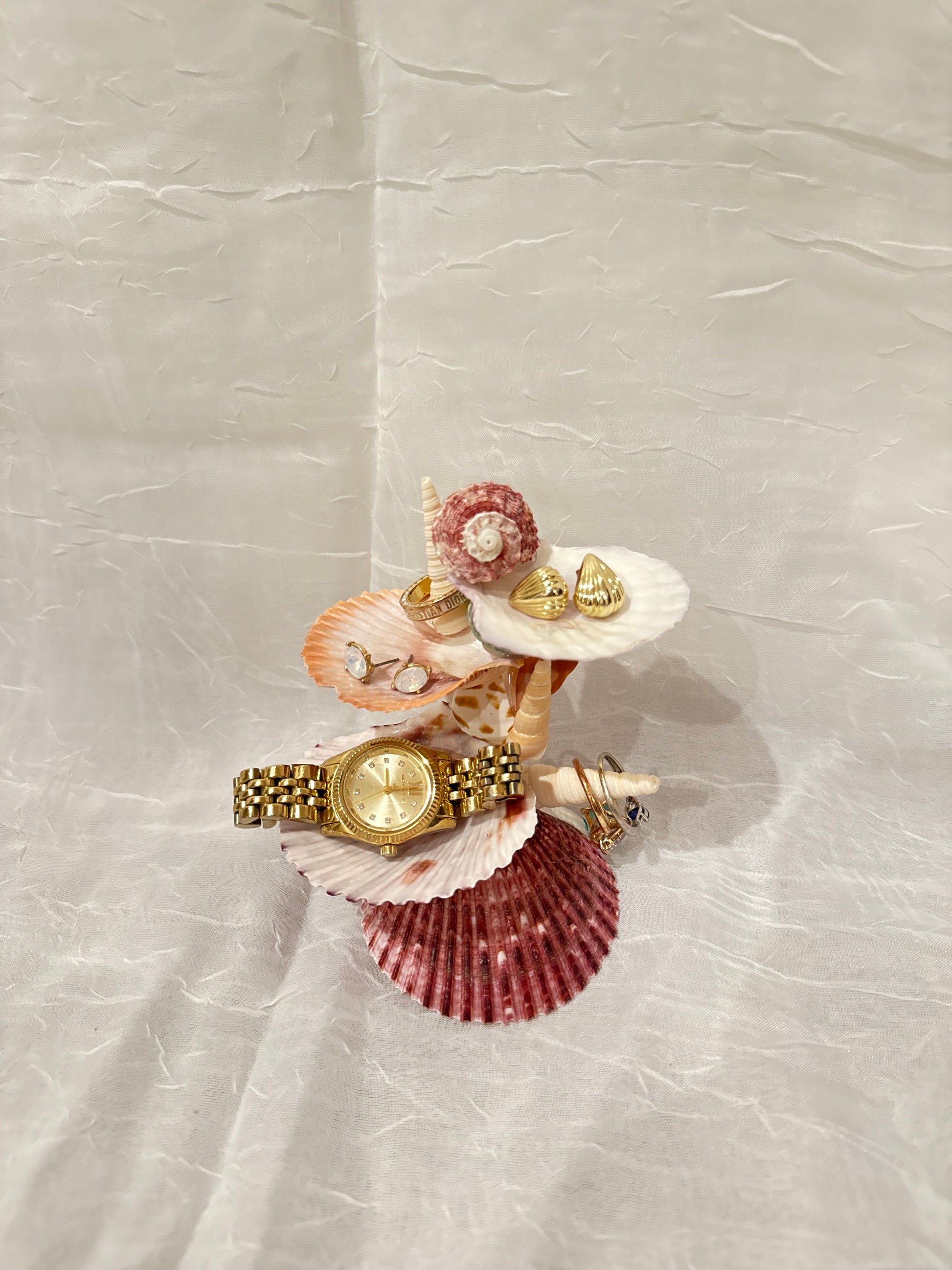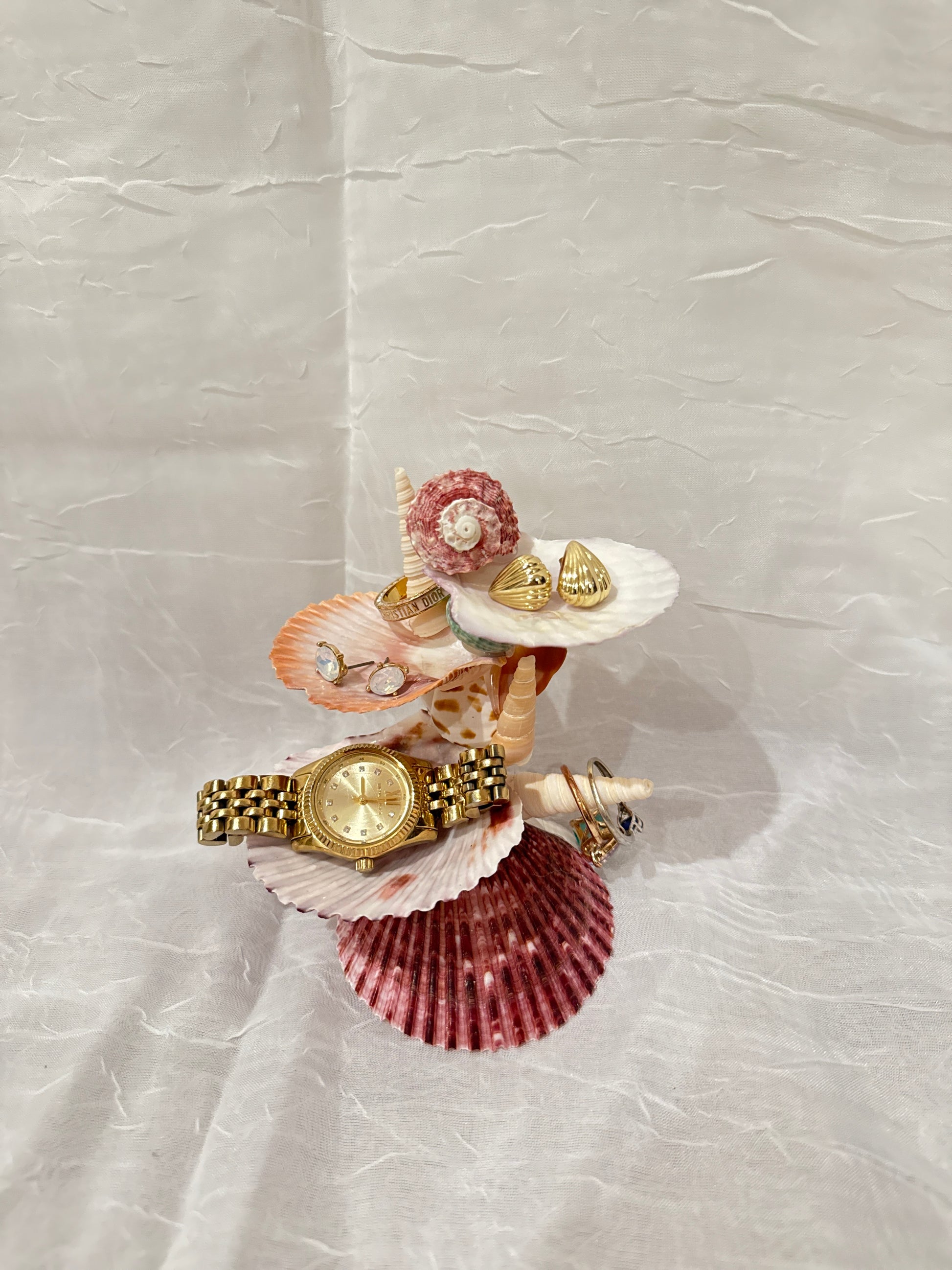 The Crimson Tide Seashell Jewelry Stand is a statement piece that combines coastal beauty with functional elegance. Handcrafted from real seashells in shades of ivory, blush, and deep crimson, it’s designed to showcase your rings, earrings, watches, and bracelets with effortless style. Each tier is formed from naturally unique shells, accented by spiral and textured pieces that add sculptural interest. Perfect for vanities, dressers, or as a thoughtful gift for jewelry lovers, this one-of-a-kind stand transforms your treasures into an art display.