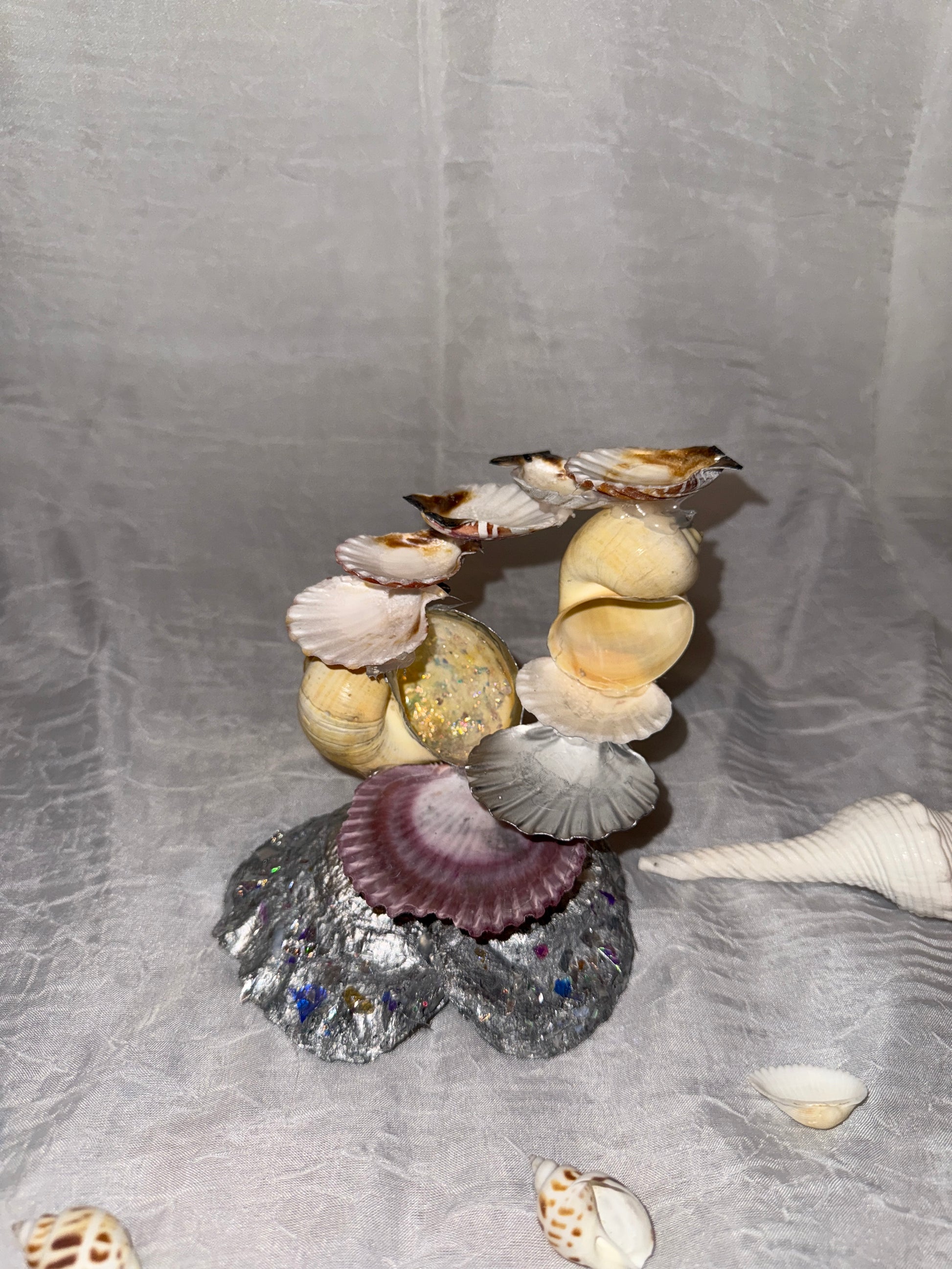 Bring the beach to your vanity. This one-of-a-kind jewelry stand is hand-built from real, ethically sourced seashells arranged in a graceful spiral arc. The scallop “dishes” cradle rings and studs, while the shimmering, resin-kissed center stone and textured base add coastal sparkle. Art decor + functional storage in one statement piece.