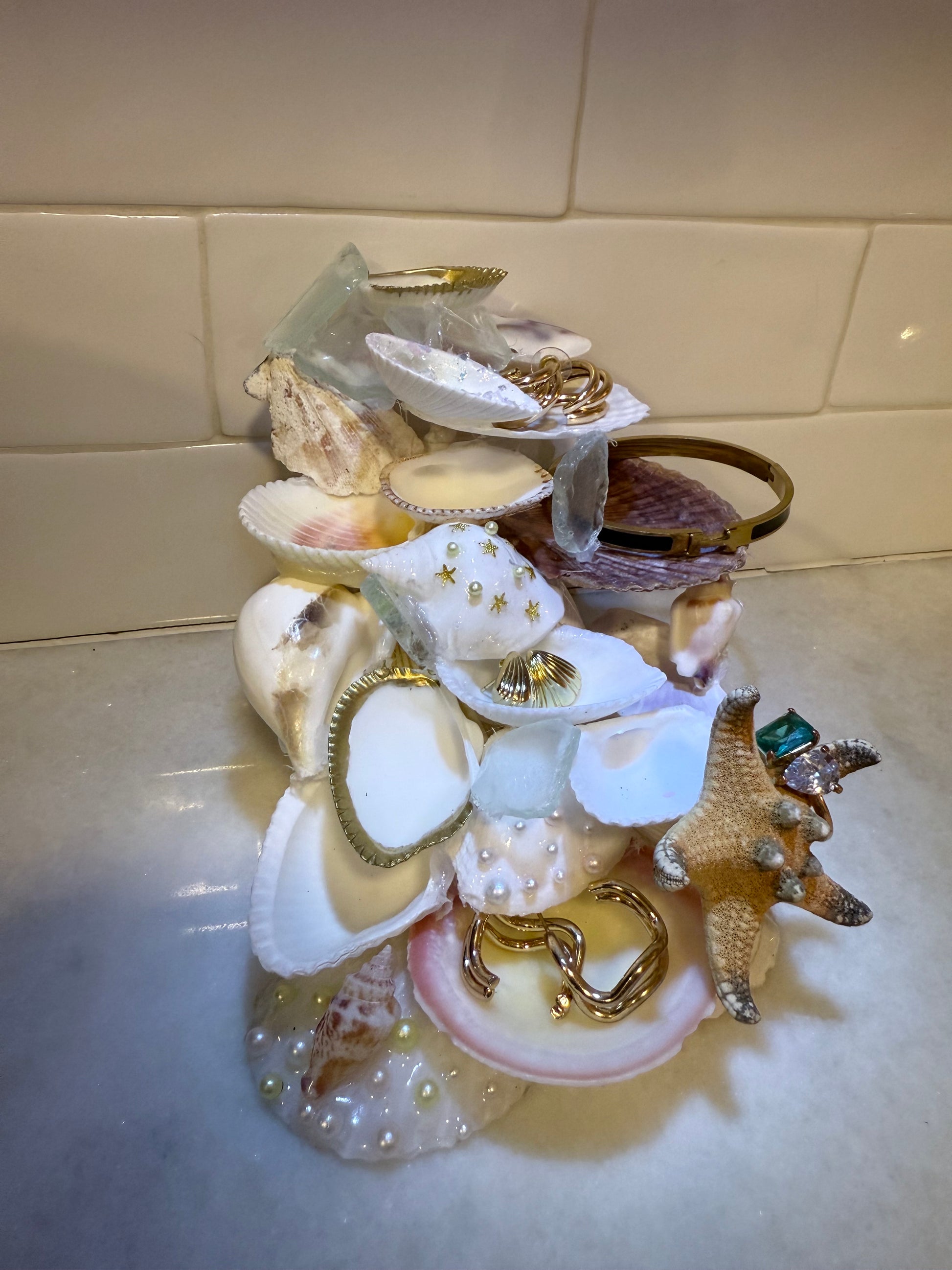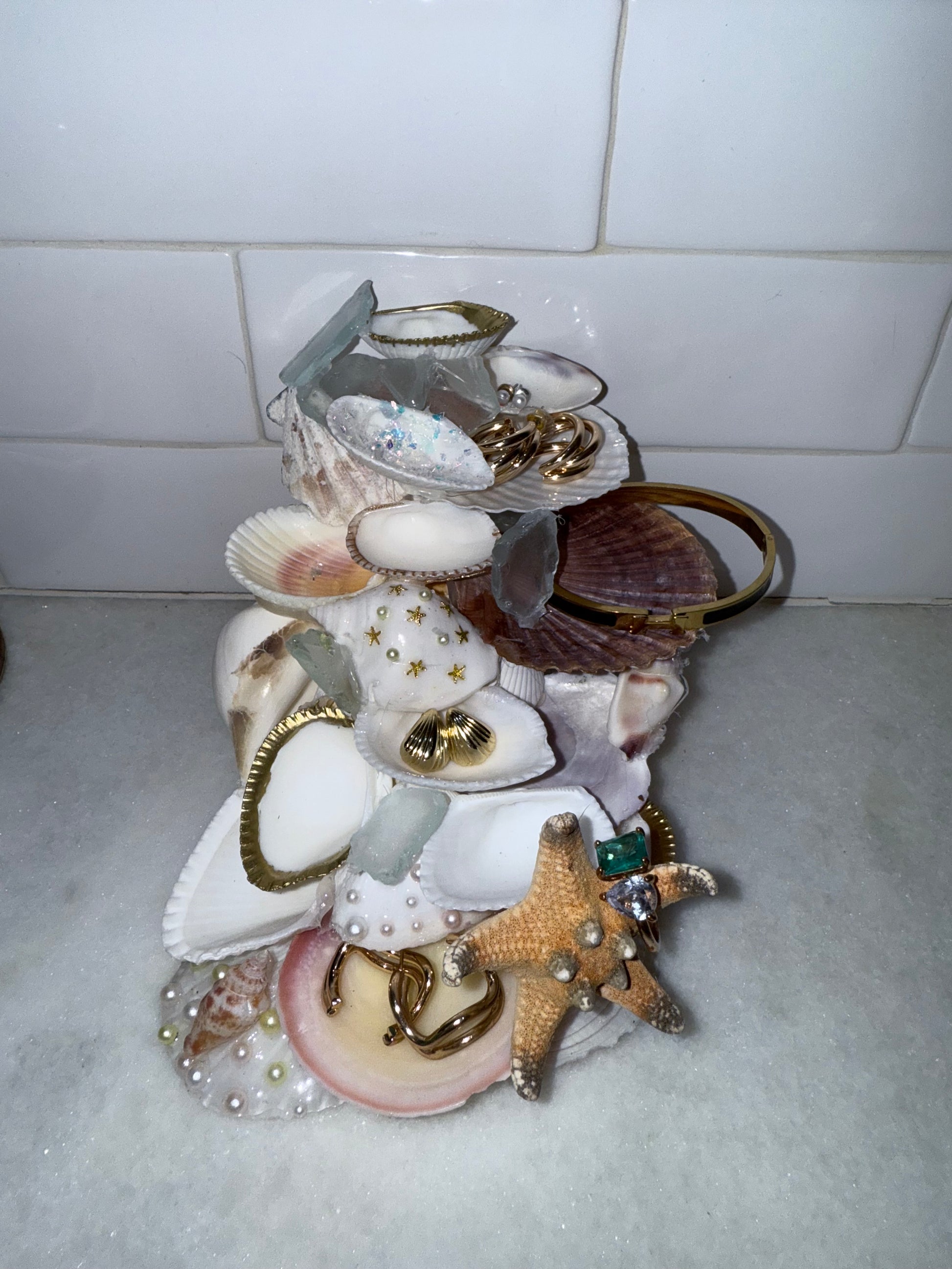 Elevate your space with this stunning handcrafted seashell jewelry holder, featuring genuine sea glass, gold-accented shells, and a natural starfish. Layered in dreamy whites, iridescent sparkles, and pearlescent touches, this piece isn’t just a jewelry stand—it’s a functional piece of art. Perfect for organizing rings, earrings, or bracelets with a touch of beachy luxury.