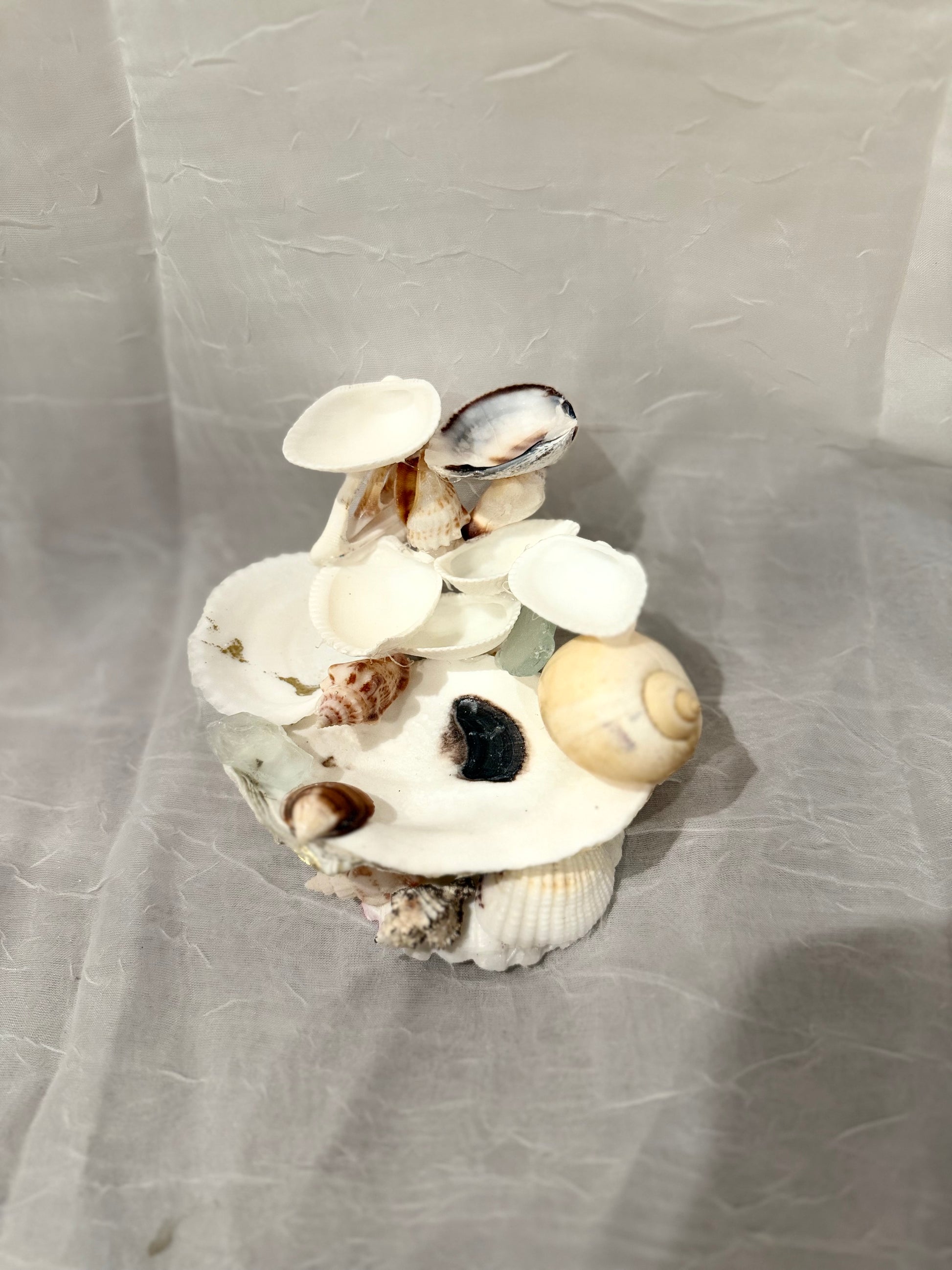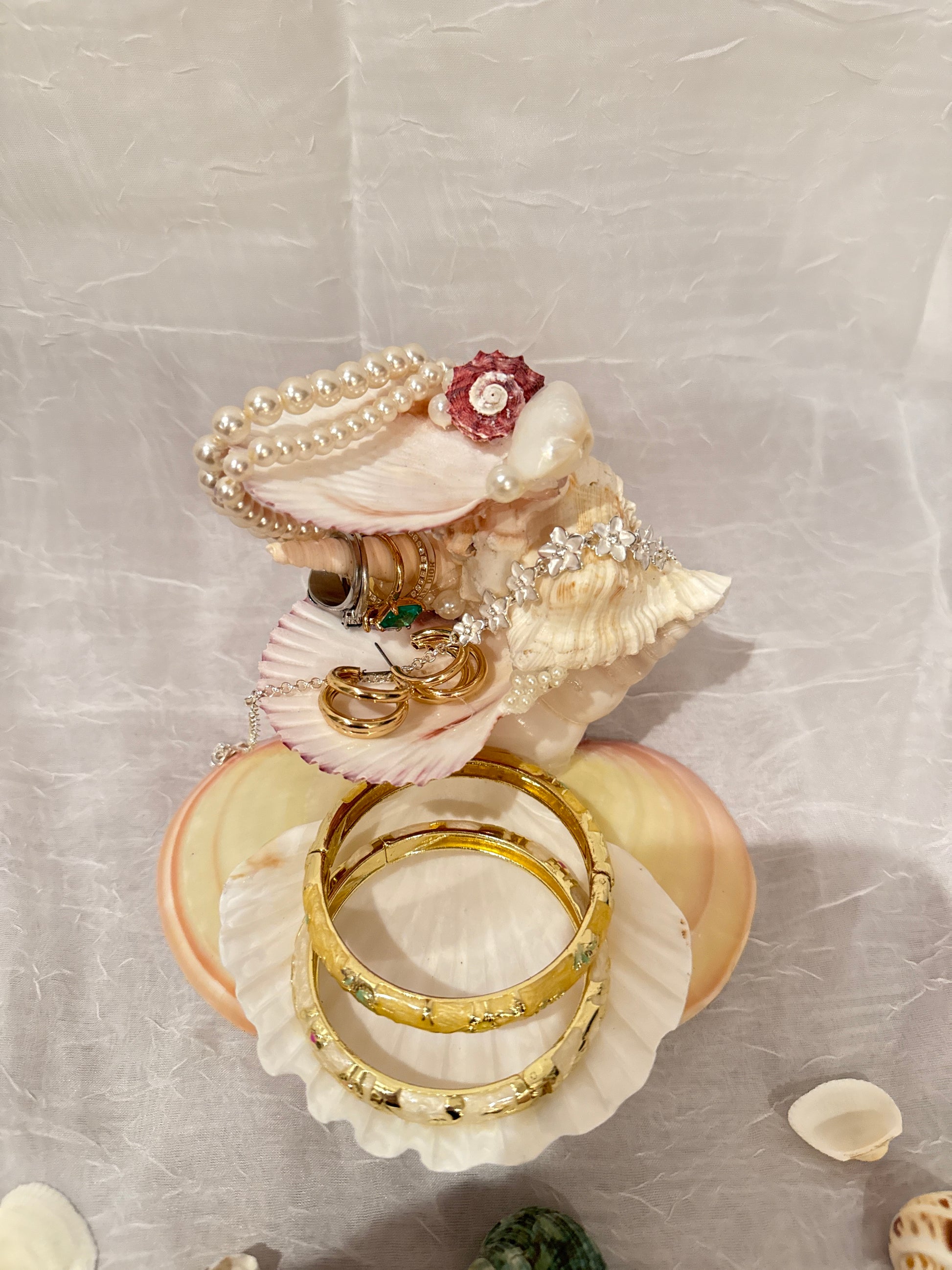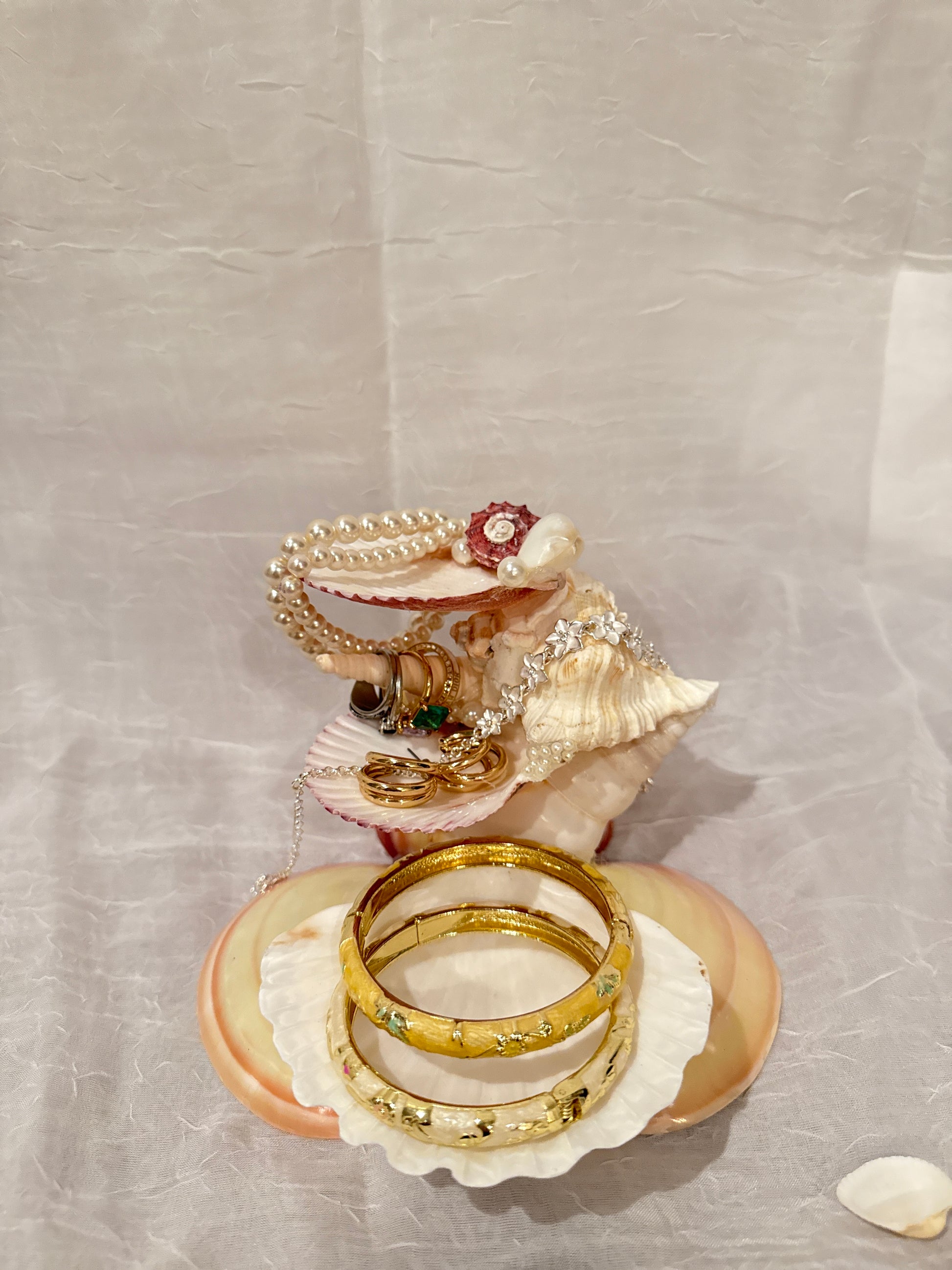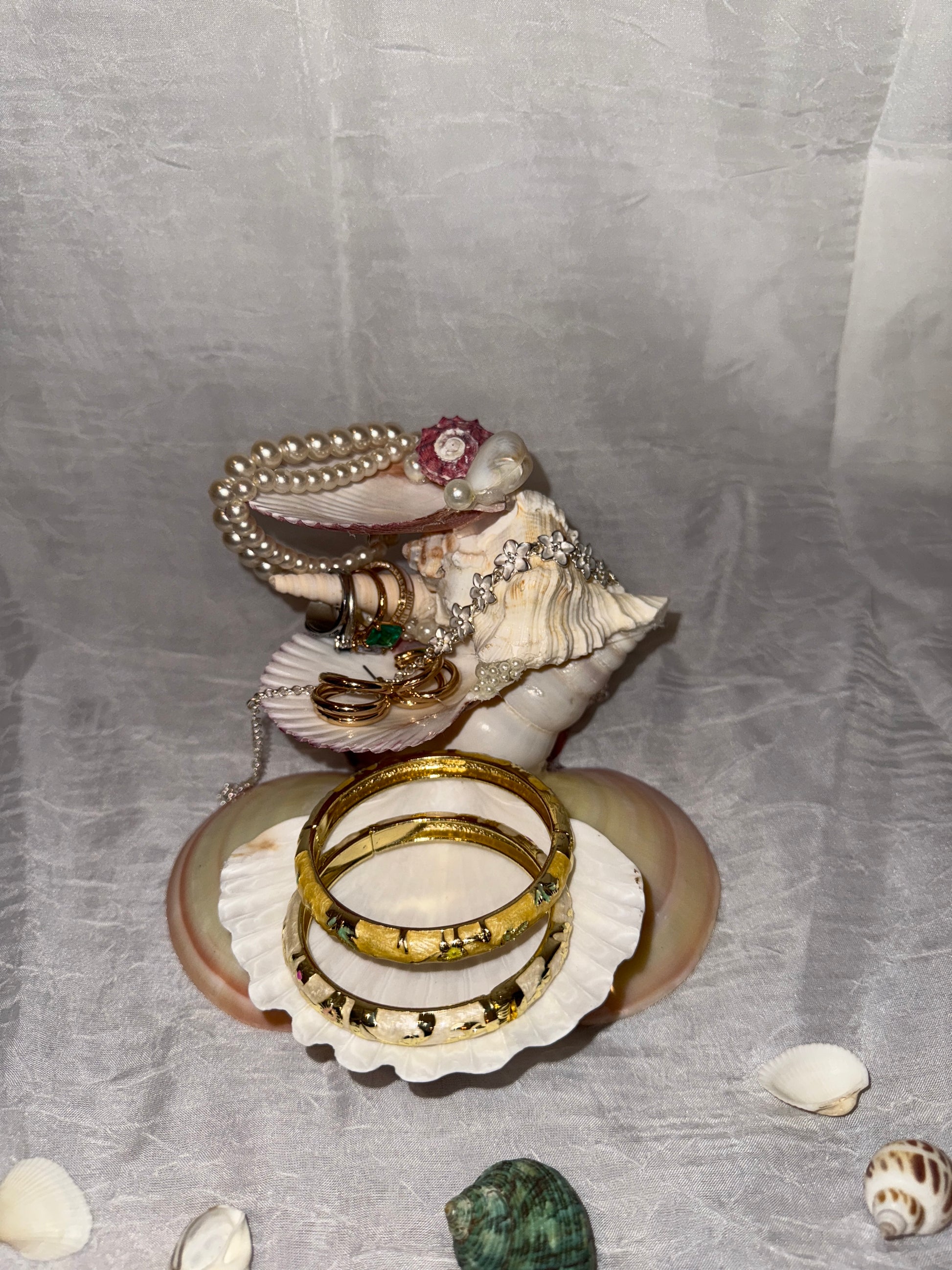 Graceful and timeless, the Pearl Bloom Seashell Jewelry Stand is a handcrafted treasure that blends coastal beauty with elegant design. Real seashells, each uniquely shaped by nature, are carefully arranged into a tiered display adorned with delicate floral accents and pearl details. Perfect for holding rings, bracelets, and keepsakes, this stand transforms your vanity into a scene of ocean-inspired luxury.
